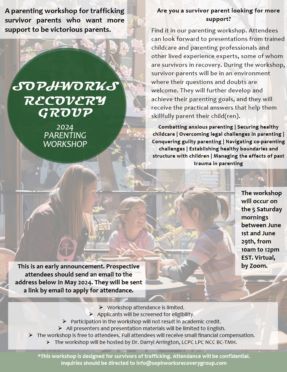 The 2024 Sophworks Recovery Group Victorious Parenting Summer Workshop will occur on 5 Saturday mornings, beginning on June 1st, ending on June 29th, from 10am to 12pm EST on each of those 5 Saturdays.